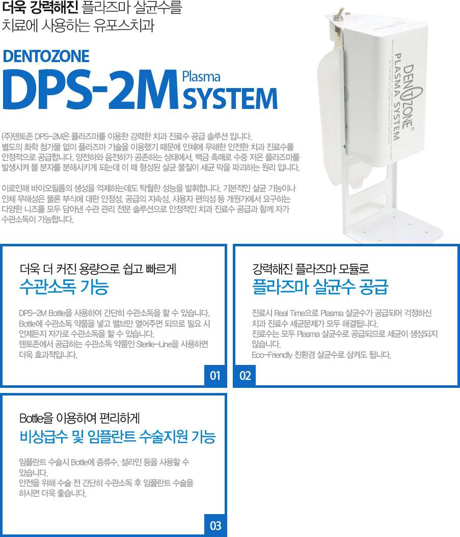 dps-2m (ÁÖ)µ§ÅäÁ¸ dps-2mÀº ÇöóÁ¸¦ ÀÌ¿ëÇÑ °·ÂÇÑ Ä¡°ú Áø·á¼ö °ø±Þ ¼Ö·ç¼Ç ÀÔ´Ï´Ù. º°µµÀÇ ÈÇР÷°¡¹° ¾øÀÌ ÇöóÁ ±â¼úÀ» ÀÌ¿ëÇ߱⠶§¹®¿¡ ÀÎü¿¡ ¹«ÇØÇÑ ¾ÈÀüÇÑ Ä¡°ú Áø·á¼ö¸¦ ¾ÈÁ¤ÀûÀ¸·Î °ø±ÞÇÕ´Ï´Ù. ¾çÀüÇÏ¿Í À½ÀüÇϰ¡ °øÁ¸ÇÏ´Â »óÅ¿¡¼, ¹é±Ý Ã˸ŷΠ¼öÁß Àú¿Â ÇöóÁ¸¦ ¹ß»ý½ÃÄÑ ¹° ºÐÀÚ¸¦ ºÐÇØ½ÃŰ°Ô µÇ´Âµ¥ ÀÌ ¶§ Çü¼ºµÈ »ì±Õ ¹°ÁúÀÌ ¼¼±Õ ¸·À» ÆÄ±«ÇÏ´Â ¿ø¸® ÀÔ´Ï´Ù. ÀÌ·ÎÀÎÇØ ¹ÙÀÌ¿ÀÇʸ§ÀÇ »ý¼ºÀ» ¾ïÁ¦Çϴµ¥µµ Ź¿ùÇÑ ¼º´ÉÀ» ¹ßÈÖÇÕ´Ï´Ù. ±âº»ÀûÀÎ »ì±Õ ±â´ÉÀ̳ª ÀÎü ¹«ÇؼºÀº ¹°·Ð ºÎ½Ä¿¡ ´ëÇÑ ¾ÈÁ¤¼º, °ø±ÞÀÇ Áö¼Ó¼º, »ç¿ëÀÚ ÆíÀǼº µî °³¿ø°¡¿¡¼ ¿ä±¸ÇÏ´Â ´Ù¾çÇÑ ´ÏÁ ¸ðµÎ ´ã¾Æ³½ ¼ö°ü °ü¸® Àü¹® ¼Ö·ç¼ÇÀ¸·Î ¾ÈÁ¤ÀûÀÎ Ä¡°ú Áø·á¼ö °ø±Þ°ú ÇÔ²² ÀÚ°¡ ¼ö°ü¼Òµ¶ÀÌ °¡´ÉÇÕ´Ï´Ù. ´õ¿í ´õ Ä¿Áø ¿ë·®À¸·Î ½±°í ºü¸£°Ô ¼ö°ü¼Òµ¶ °¡´É DPS-2M BottleÀ» »ç¿ëÇÏ¿© °£´ÜÈ÷ ¼ö°ü¼Òµ¶À» ÇÒ ¼ö ÀÖ½À´Ï´Ù. Bottle¿¡ ¼ö°ü¼Òµ¶ ¾àǰÀ» ³Ö°í ¹ëºê¸¸ ¿¾îÁÖ¸é µÇ¹Ç·Î ÇÊ¿ä ½Ã ¾ðÁ¦µçÁö ÀÚ°¡·Î ¼ö°ü¼Òµ¶À» ÇÒ ¼ö ÀÖ½À´Ï´Ù. µ§ÅäÁ¸¿¡¼ °ø±ÞÇÏ´Â ¼ö°ü¼Òµ¶ ¾àǰÀÎ Sterile-LineÀ» »ç¿ëÇÏ¸é ´õ¿í È¿°úÀûÀÔ´Ï´Ù. °·ÂÇØÁø ÇöóÁ ¸ðµâ·Î ÇöóÁ »ì±Õ¼ö °ø±Þ Áø·á½Ã Real TimeÀ¸·Î Plasma »ì±Õ¼ö°¡ °ø±ÞµÇ¾î °ÆÁ¤ÇϽŠġ°ú Áø·á¼ö ¼¼±Õ¹®Á¦°¡ ¸ðµÎ ÇØ°áµË´Ï´Ù. Áø·á¼ö´Â ¸ðµÎ Plasma »ì±Õ¼ö·Î °ø±ÞµÇ¹Ç·Î ¼¼±ÕÀÌ »ý¼ºµÇÁö ¾Ê½À´Ï´Ù. Eco-Friendly ģȯ°æ »ì±Õ¼ö·Î »ïÄѵµ µË´Ï´Ù. BottleÀ» ÀÌ¿ëÇÏ¿© Æí¸®ÇÏ°Ô ºñ»ó±Þ¼ö ¹× ÀÓÇöõÆ® ¼ö¼úÁö¿ø °¡´É ÀÓÇöõÆ® ¼ö¼ú½Ã Bottle¿¡ Áõ·ù¼ö, ¼³¶óÀÎ µîÀ» »ç¿ëÇÒ ¼ö ÀÖ½À´Ï´Ù. ¾ÈÀüÀ» À§ÇØ ¼ö¼ú Àü °£´ÜÈ÷ ¼ö°ü¼Òµ¶ ÈÄ ÀÓÇöõÆ® ¼ö¼úÀ» ÇÏ½Ã¸é ´õ¿í ÁÁ½À´Ï´Ù.